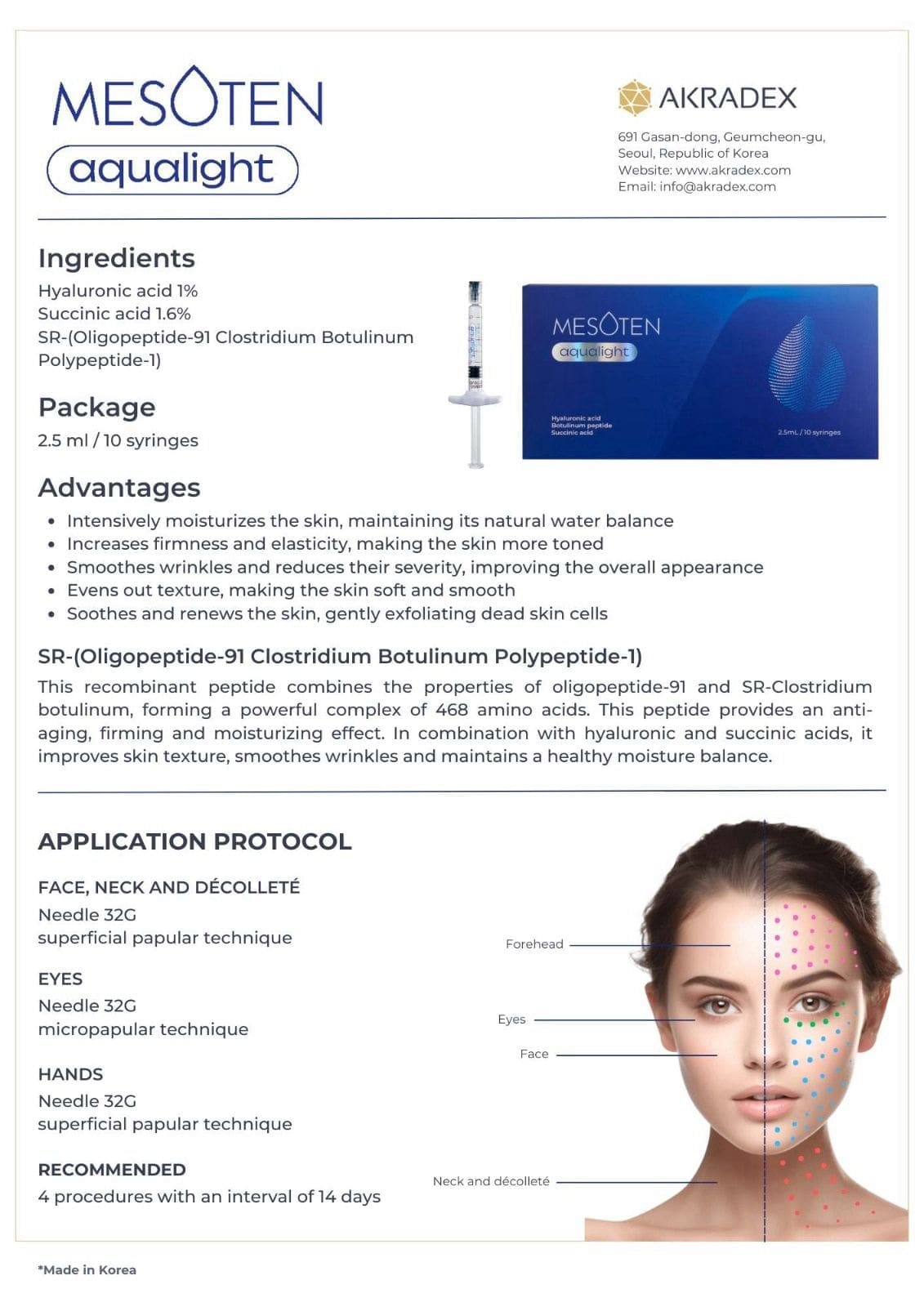 This recombinant peptide combines the properties of oligopeptide-91 and SR-Clostridium botulinum, forming a powerful complex of 468 amino acids. This peptide provides an anti-aging, firming and moisturizing effect. In combination with hyaluronic and succinic acids, it improves skin texture, smoothes wrinkles and maintains a healthy moisture balance.